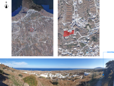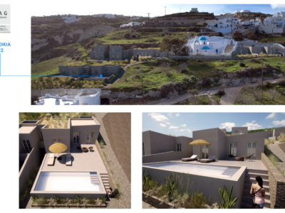 The project is located on Vourvoulos village. Vourvoulos is a small, quiet village located on the north east part of Santorini, about 4 kilometers from the capital Fira. It is amphitheatrically built on a slope that overlooks the east region of the island with the broad plains. The panorama from Vourvoulos is awe-inspiring as its position offers magnificent views to vast vineyards, meadows and shores.