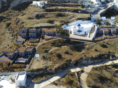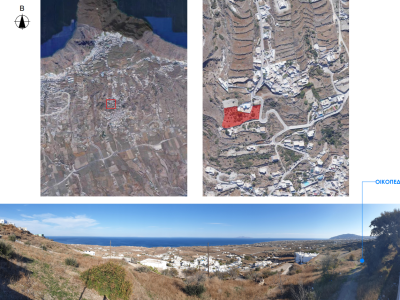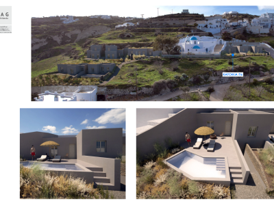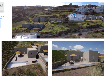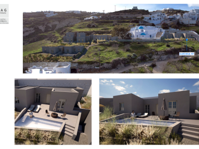The project is located on Vourvoulos village. Vourvoulos is a small, quiet village located on the north east part of Santorini, about 4 kilometers from the capital Fira. It is amphitheatrically built on a slope that overlooks the east region of the island with the broad plains. The panorama from Vourvoulos is awe-inspiring as its position offers magnificent views to vast vineyards, meadows and shores.